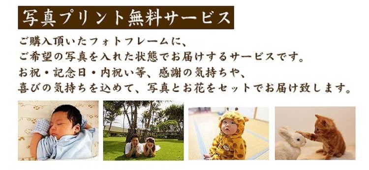 | 説明 | お気に入りの写真とお花を一緒に飾る。 記念に残る、素敵な贈り物になります。 ご希望のお客様には、写真印刷無料サービス!(L版 横向き限定) ご希望の写真をセットしてお届け出来ます。 クリアケース(有料)の有無を選択頂けます。 |