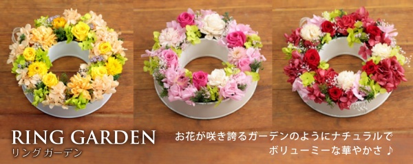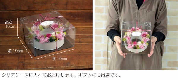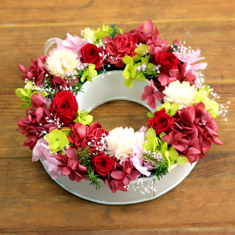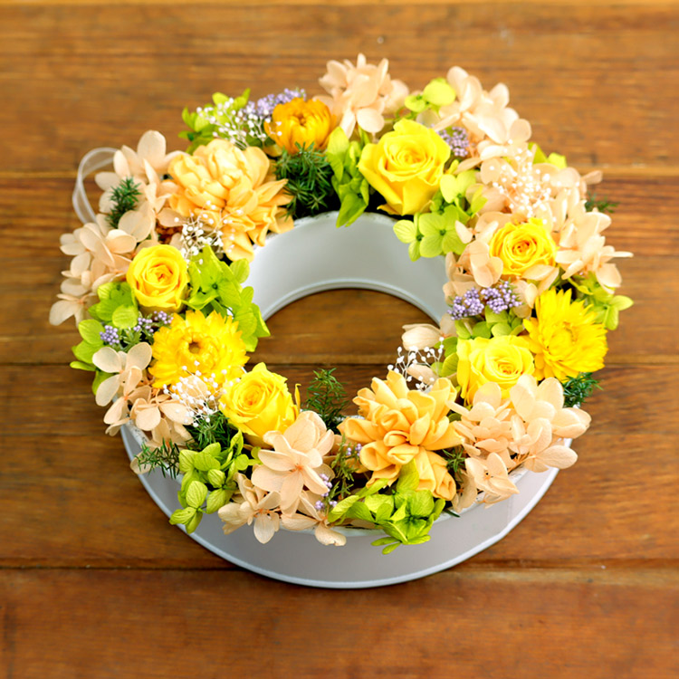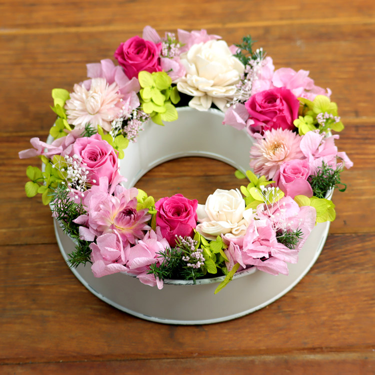 | 説明 | リング型のブリキに、お花が咲き誇るガーデンのようにナチュラル&ボリューミーに詰め込みました。 アレンジメントとしてだけではなく、壁にかければリースとしても使えます。ケース付きです。 |