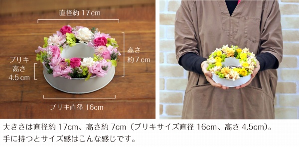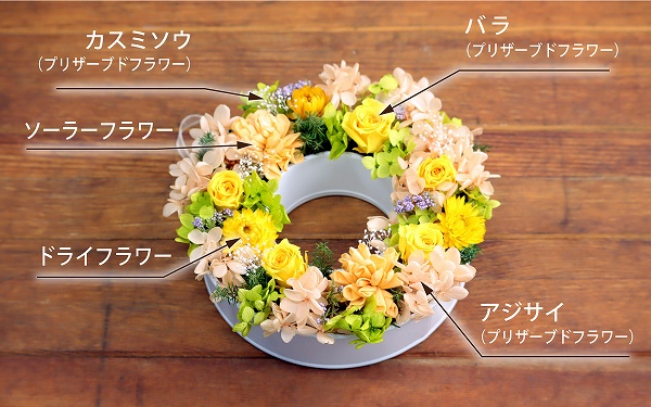 | 花材 | プリザーブドフラワー:バラ・カスミソウ・アジサイ 造花:アジサイ・小花・葉物 その他:ソーラーフラワー *花の色味・花材&資材の一部が変更になる場合がございます。 *個々のお客様のモニターによって、色味が異なる場合がございます。ご了承ください。 |