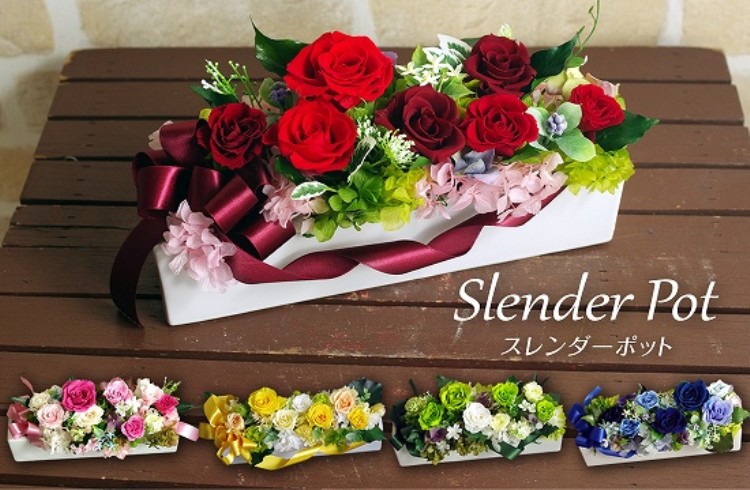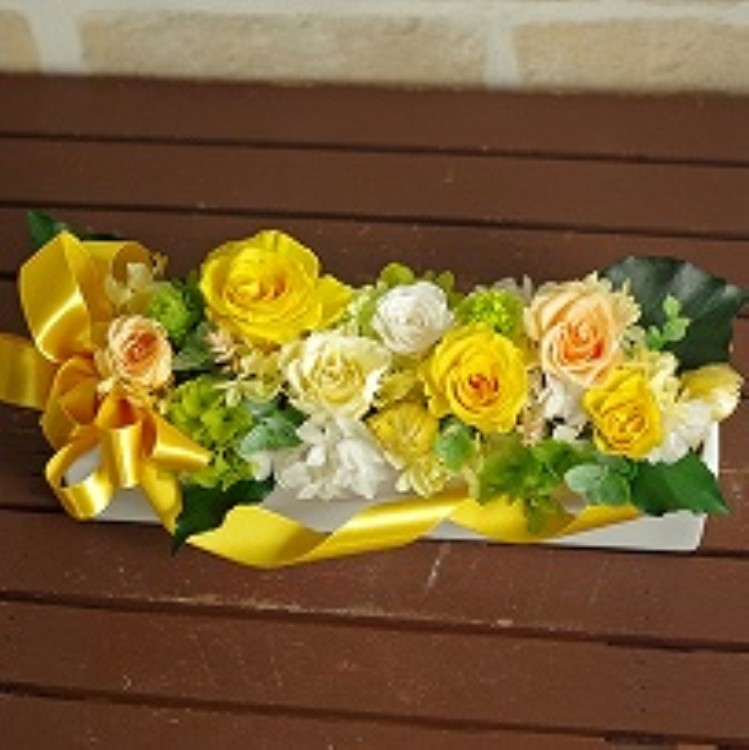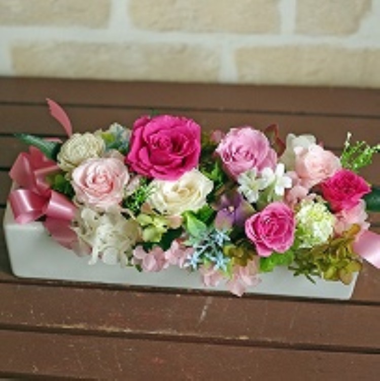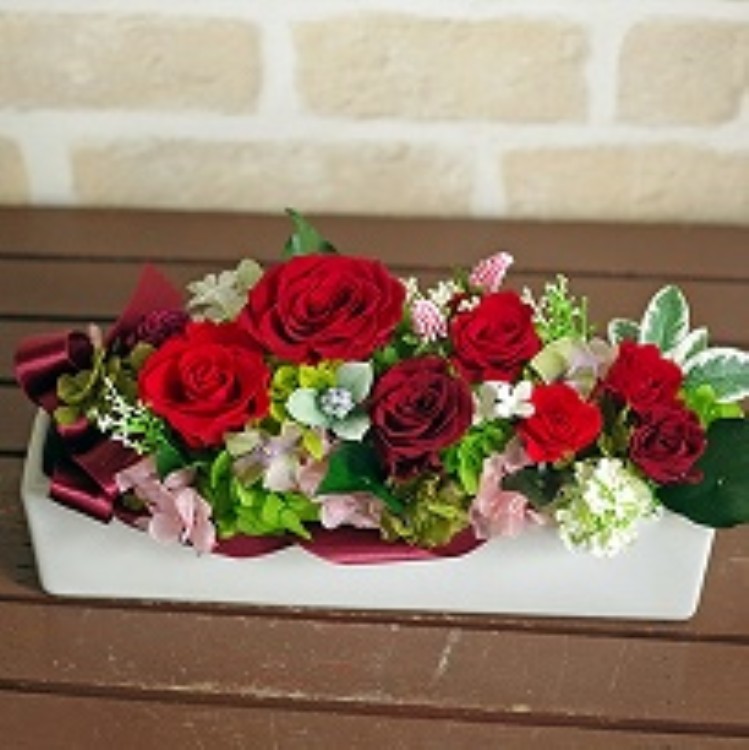 | シンプルな長角タイプで、置き場所を選ばず飾りやすい 安定した低めの花器に、たっぷりとプリザーブドフラワーが詰め込まれたアレンジ。 ゴージャスなリボンがついてボリューム満点の華やかさは贈り物にも最適です。 |