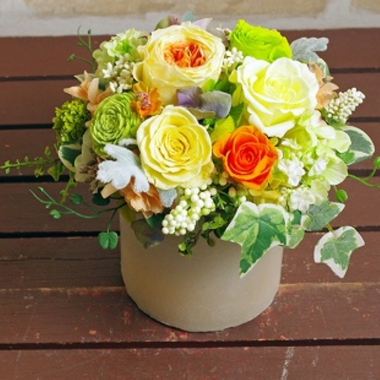| 花材 | プリザーブドフラワー:バラ・アジサイ 等 ソーラーフラワー 造花:小花・葉物 等 *器のデザイン、花の色味・花材&資材の一部が変更になる場合がございます。 *個々のお客様のモニターによって、色味が異なる場合がございます。ご了承ください。 |