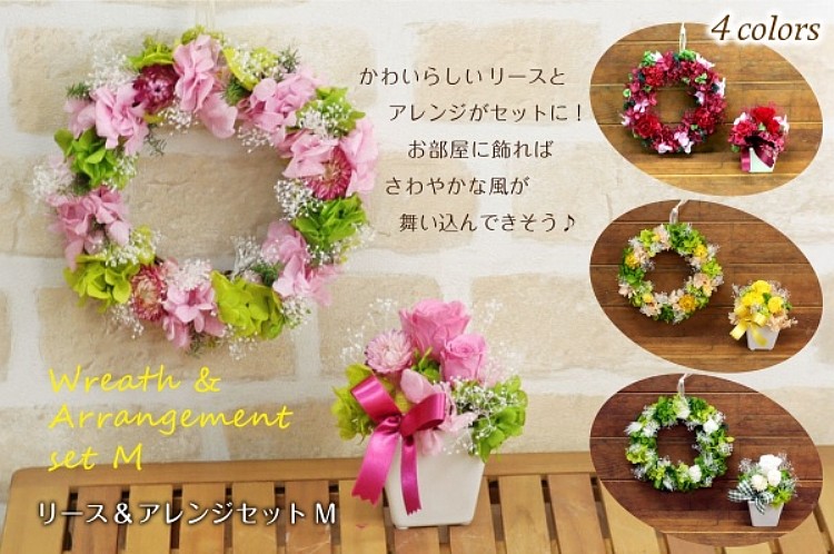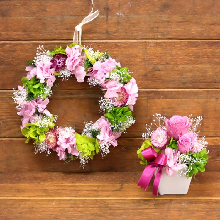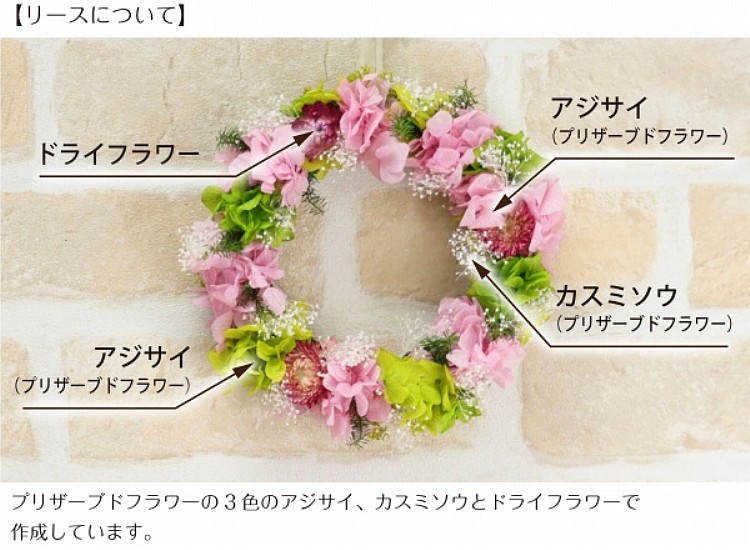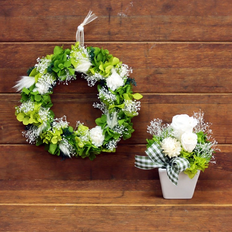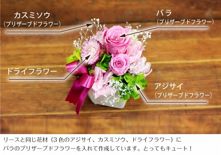 | 花材 | 【リース】 プリザーブドフラワー:カスミソウ・アジサイ / その他:ドライフラワー 【アレンジ】プリザーブドフラワー:バラ・カスミソウ・アジサイ / その他:ドライフラワー *器のデザイン、花の色味・花材&資材の一部が変更になる場合がございます。 *個々のお客様のモニターによって、色味が異なる場合がございます。ご了承ください。 |