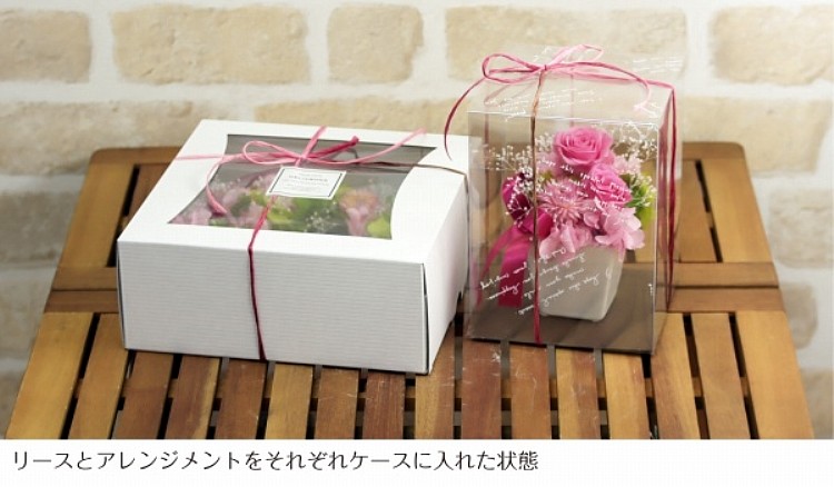 | サイズ | 【リース】 直径約17cm・高さ約5cm(ケース:縦20cm・横20cm・高さ8cm) 【アレンジ】高さ約12cm・横約9cm(ケース:縦12cm・横12cm・高さ16cm) 手作りのため、若干サイズは変わります。ご了承ください。 |