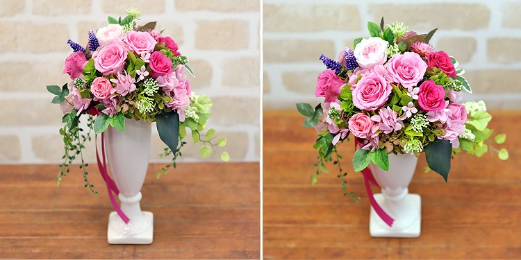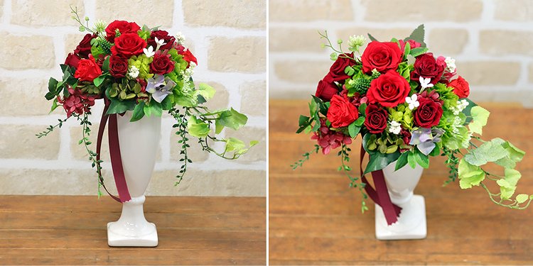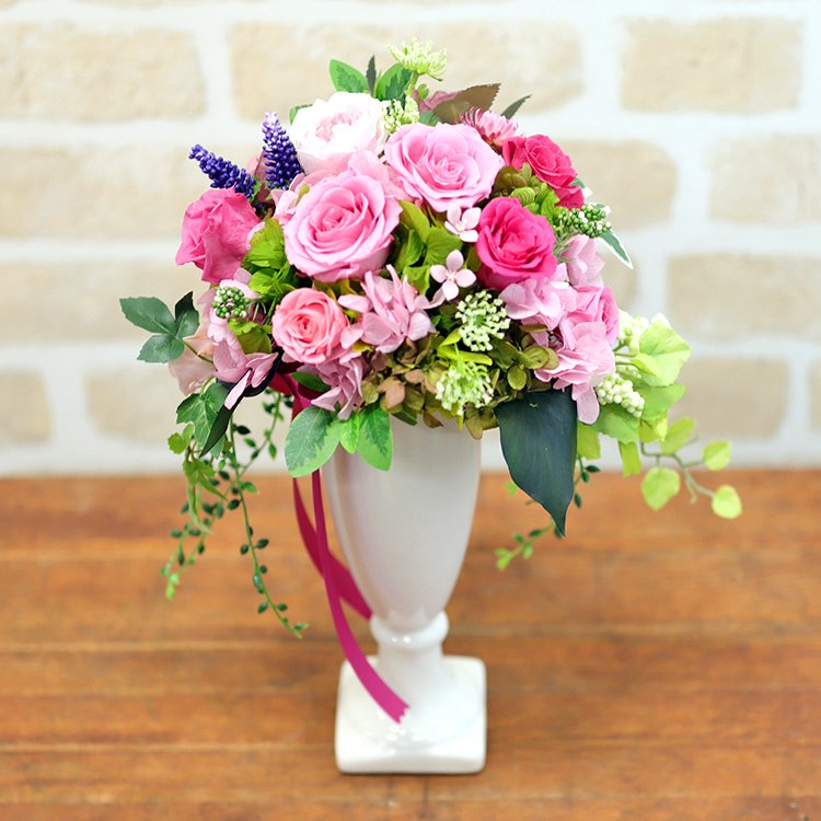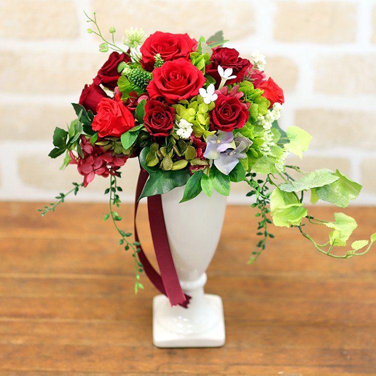 | 花材 | プリザーブドフラワー:バラ・アジサイ 等 造花:小花・葉物 等 *花器のデザイン、花の色味・花材&資材の一部が変更になる場合がございます。 *個々のお客様のモニターによって、色味が異なる場合がございます。ご了承ください。 |