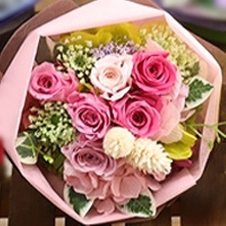 | 花材 | プリザーブドフラワー:バラ・アジサイ 造花:小花・葉物 等 *ラッピングペーパーの色味、 花の色味・花材&資材の一部が変更になる場合がございます。 *個々のお客様のモニターによって、色味が異なる場合がございます。ご了承ください。 |